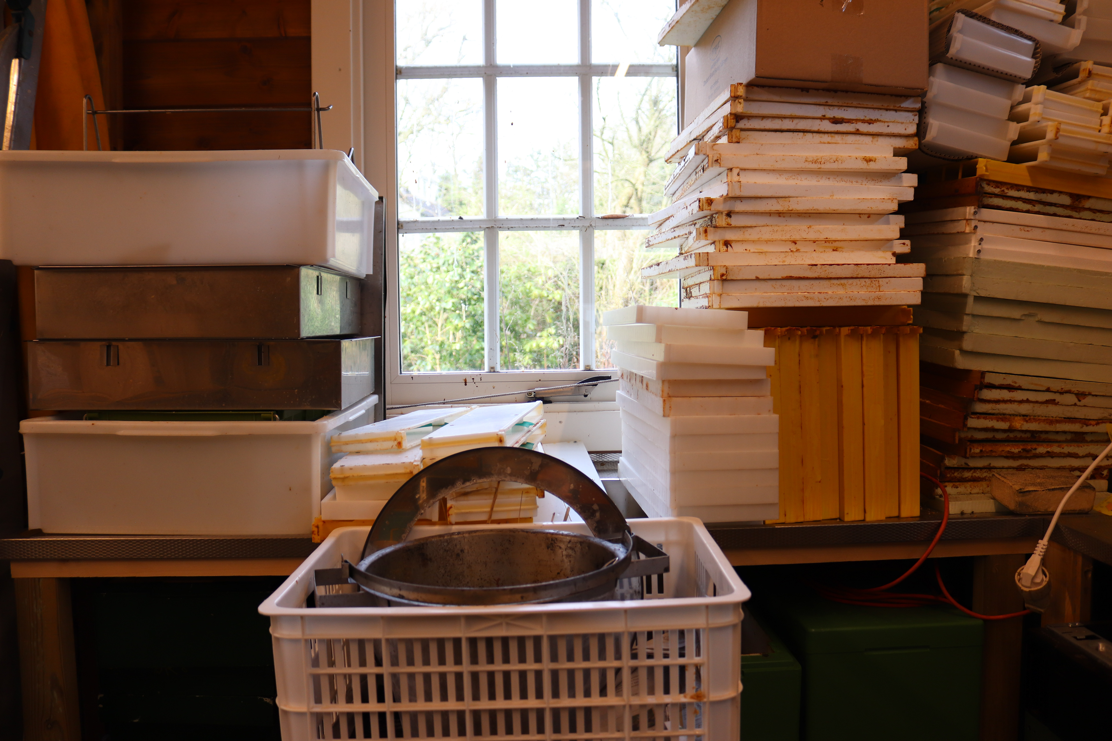 “Medium shot showing several parts of a beehive and two beehives underneath the counter. The different parts are stocked on top of each other on a counter. This picture shows part of the beekeeping material culture and the way Steven stores his materials”