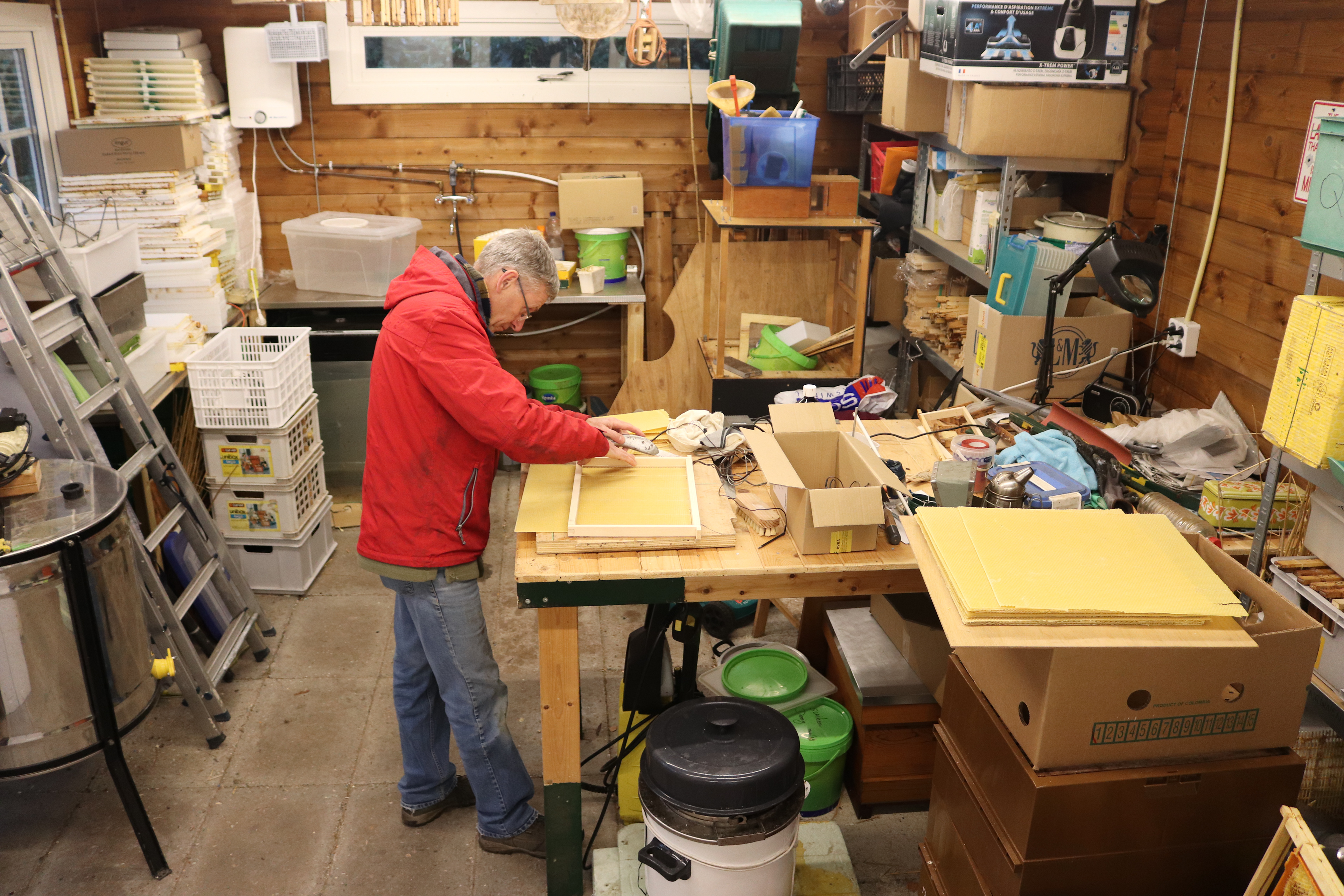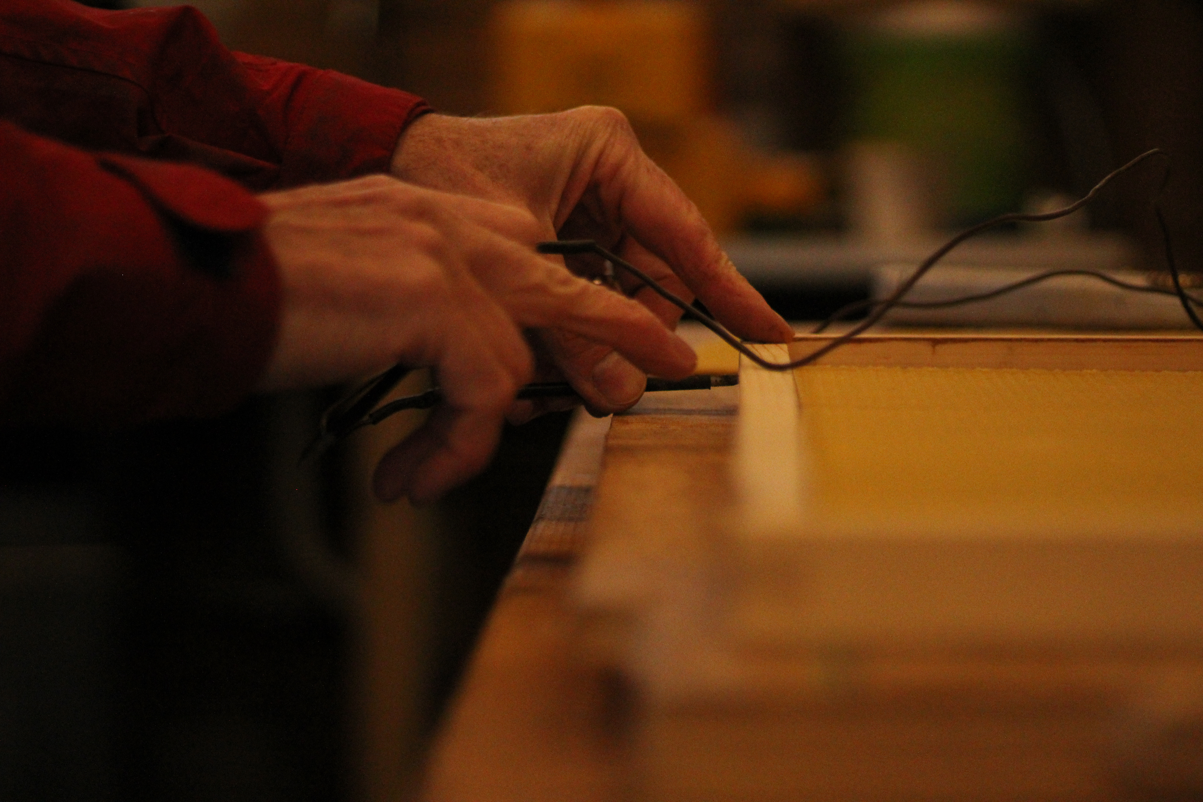 “Close-up of home made frame making with a ‘transformer’. Steven is using a transformer to attach the beeswax sheet to the frame, which can then be placed inside a beehive. Frame making constitutes a big part of the work Steven carries out during this time of year; the ‘preparation phase’ before bees start to be more active and more work has to be done. This picture shows something about how Steven approaches beekeeping; he prefers to make the frames and beeswax himself, instead of buying them pre-made”