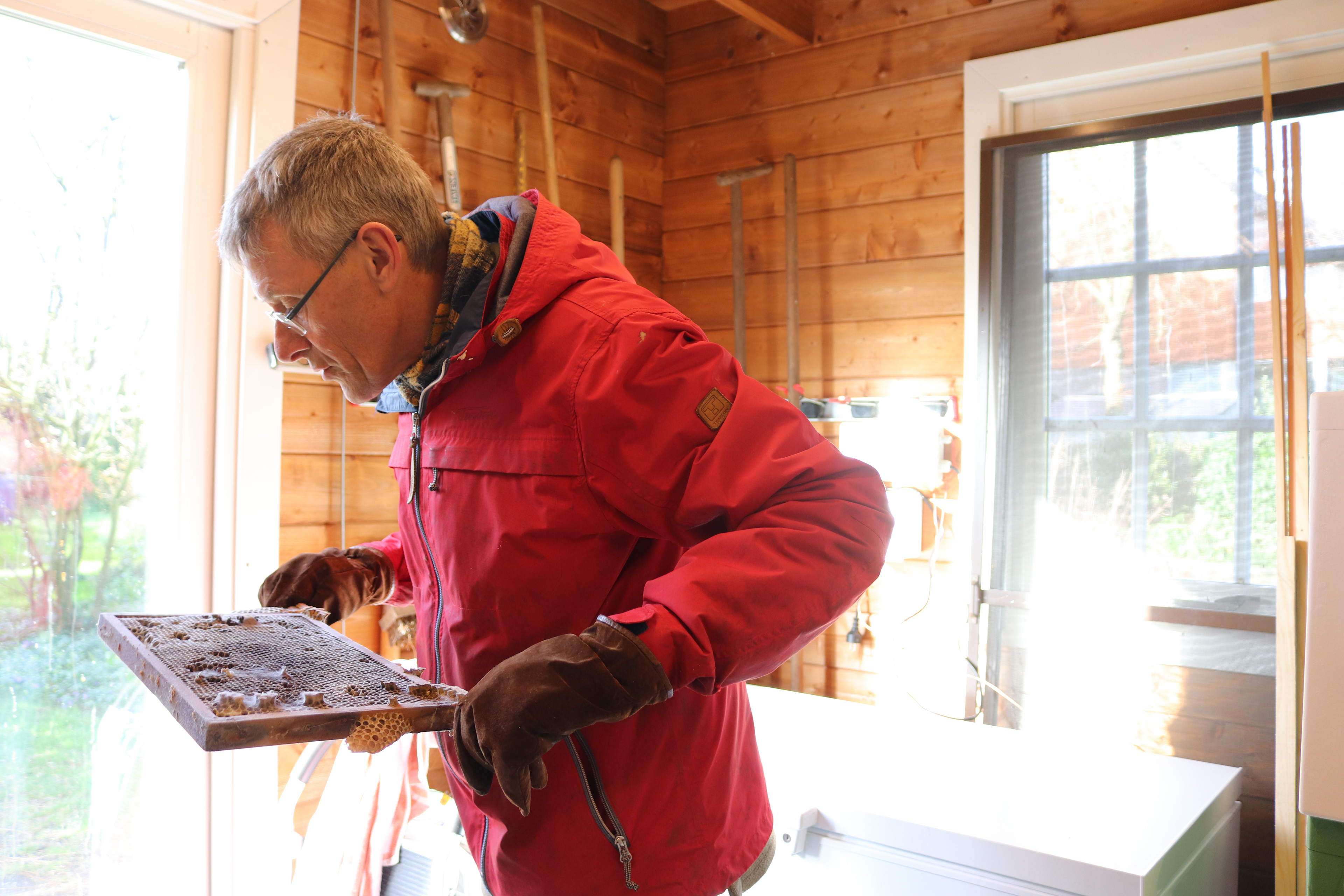“Medium shot inside Steven’s shed of him examining a frame taken out of the freezer (in the background). The frame is placed inside the freezer to kill the parasites and to protect his bees. Since the frame is cold Steven is holding it with gloves.The light coming through the window gives the feeling of the early spring sun”