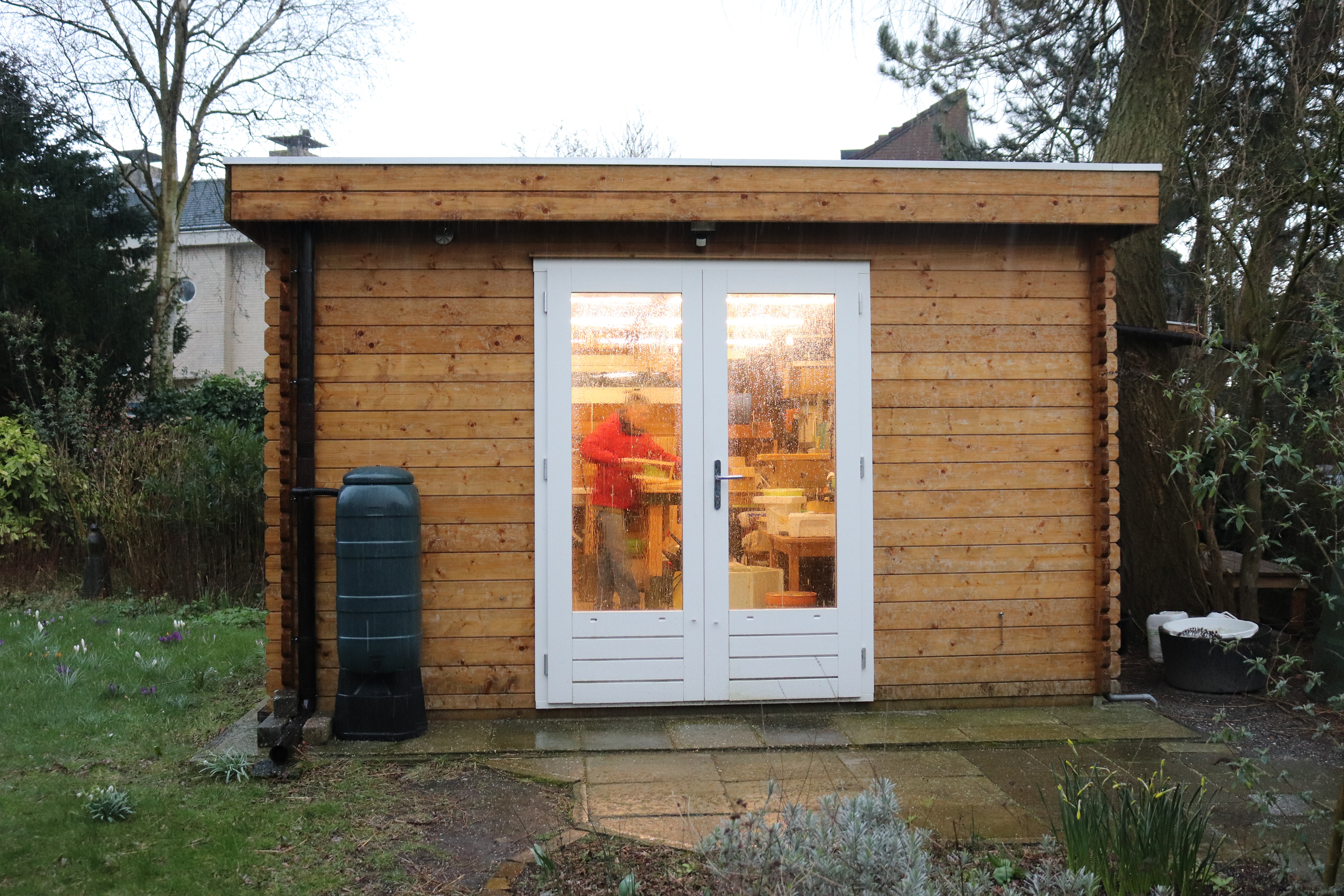 “Wide shot of the outside of the shed. This picture especially shows the season and the weather of the time the pictures were taken: it was the end of a rainy, early Spring day (since we see flowers). The rain barrel says something about Steven’s relation to nature; he likes to work with what nature provides (like rain to water the flowers which he especially planted for the bees)”