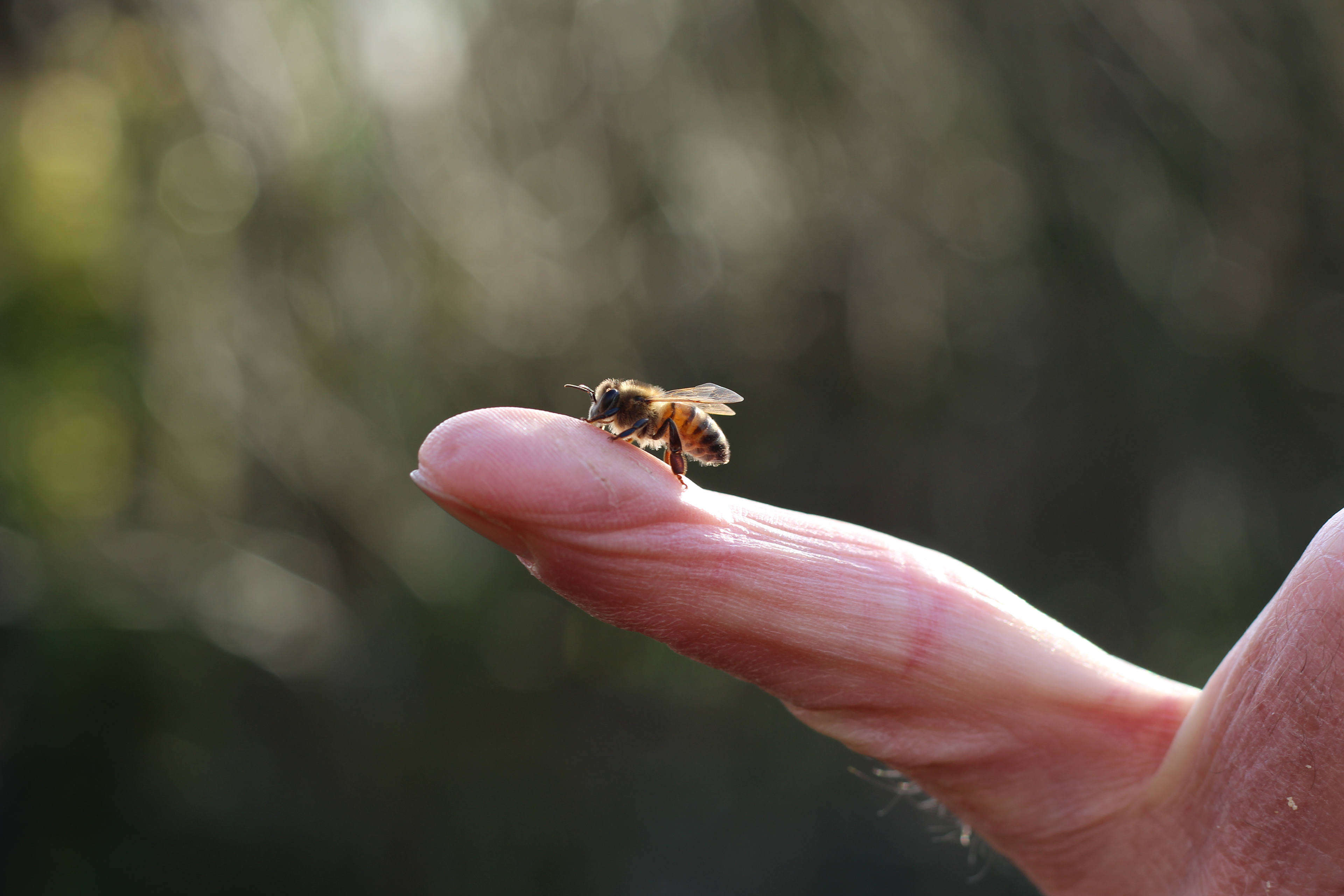 “Close-up of Steven showing a bee on his finger in his garden. Shows the relation between Steven and bees; he is confident enough the bee is not going to hurt him. Steven is teaching us about how bees breath, he enjoys explaining.”