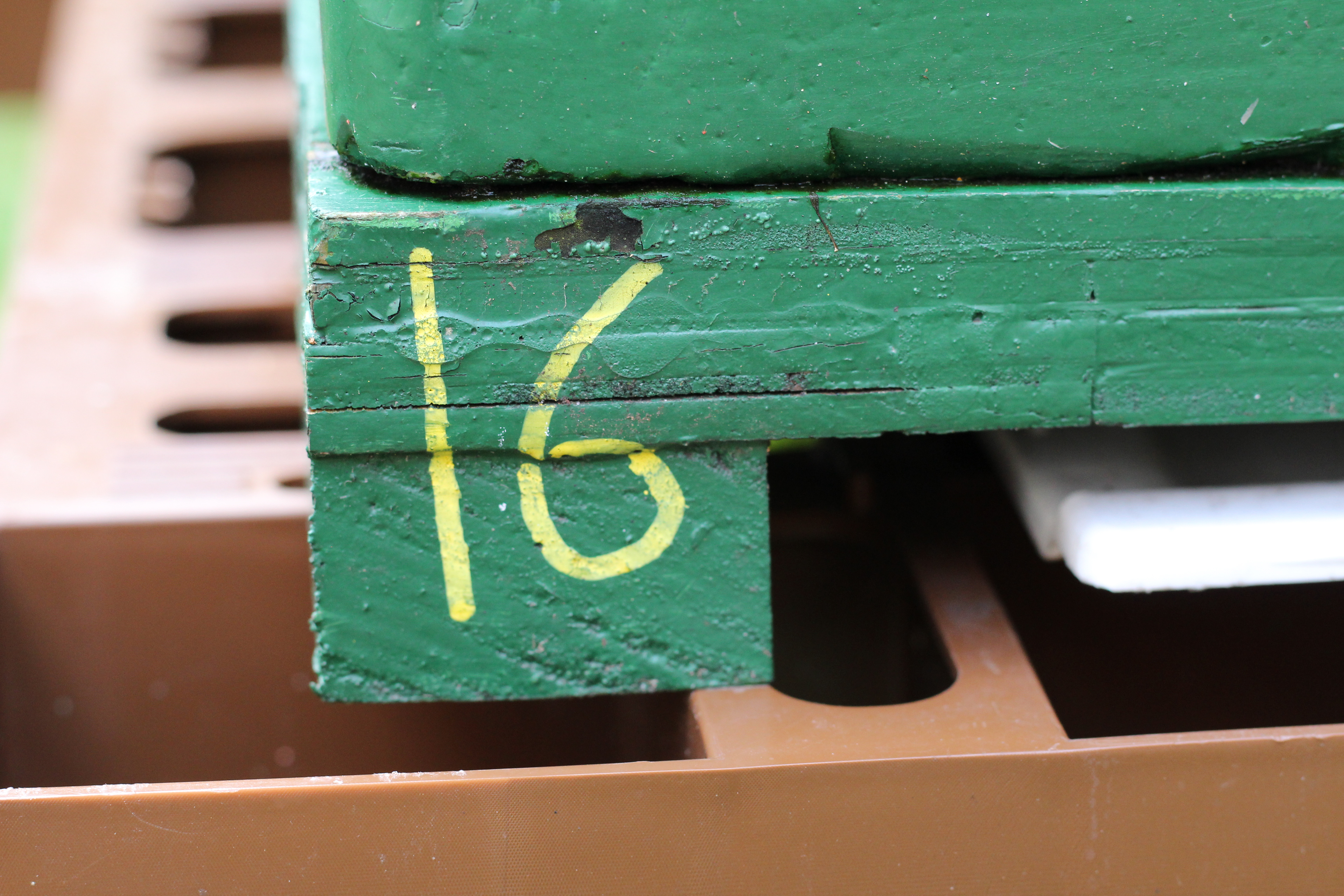 “Extreme close-up of a beehive identification number. This helps Steven catalogue them in Microsoft Excel. This way he knows all the different details of each beehive population. System of beekeeping”