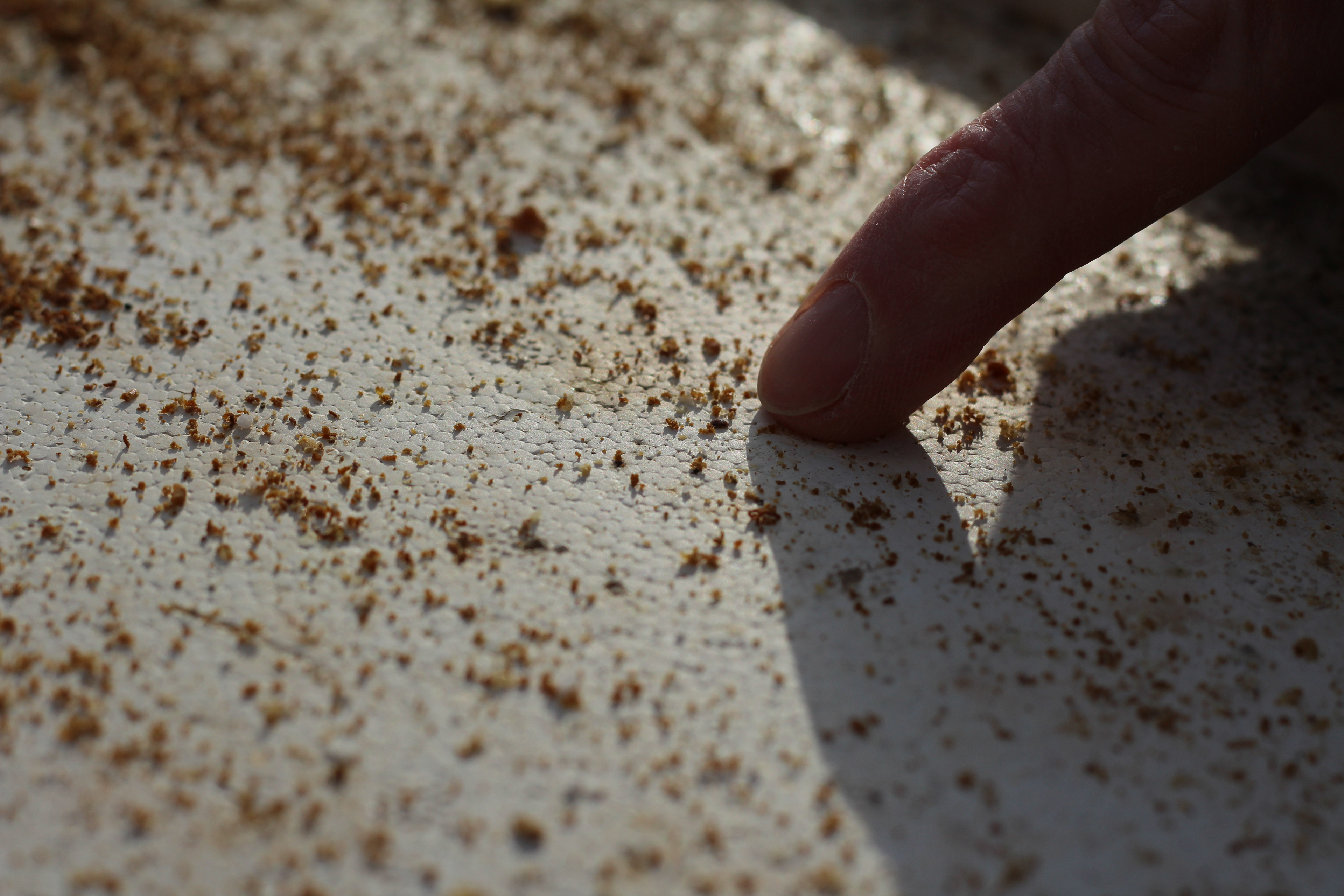“Close-up of Steven pointing out to us a parasite on a beehive tray with pollen; teaching. Parasites are a challenge for Steven since they kill the bees”