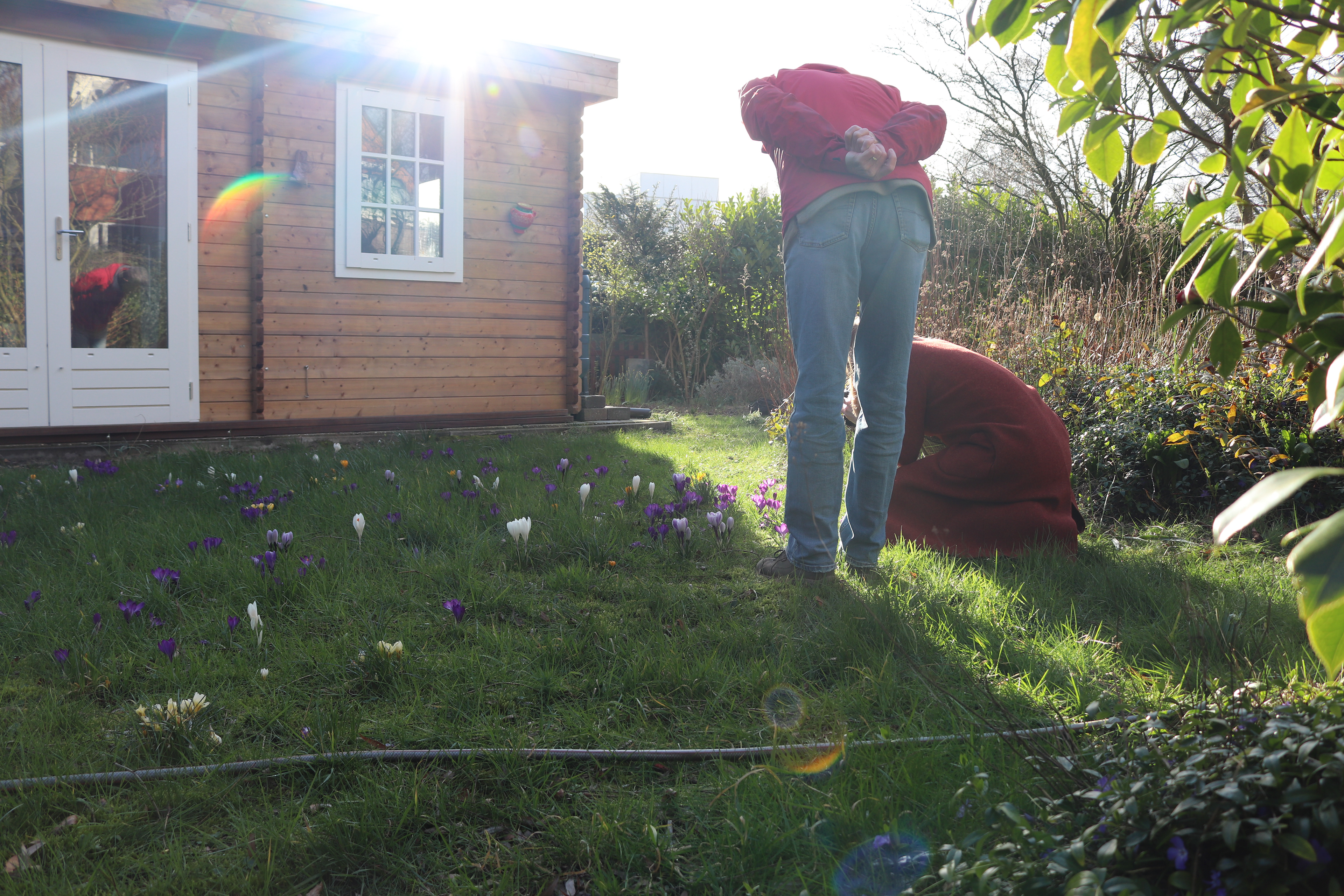 “A full shot of Steven looking at how Maxine takes pictures of blooming croci which he planted especially to accommodate his bees (food); shows the relation between beekeeper and nature. Shows how Steven is leaning forward, checking what Maxine is doing and (again) teaching about bees. Also shows the season; end of winter; early spring”
