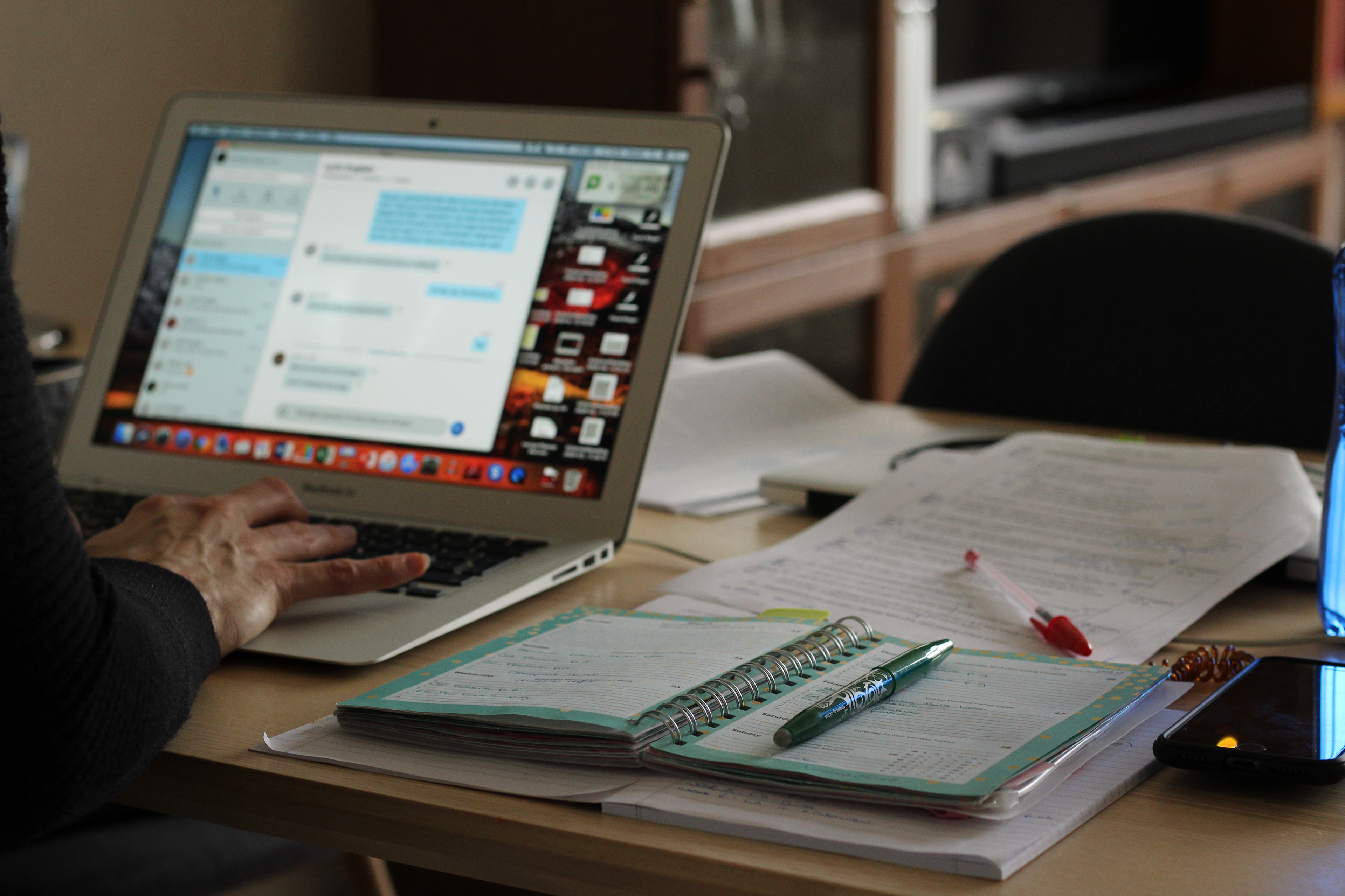 “This picture shows how my sister is communicating with her students. The chat conversation is blurry because I wanted to respect the students privacy. My sisters diary is sharp, ready for her to grab, still important for her as a teacher.”